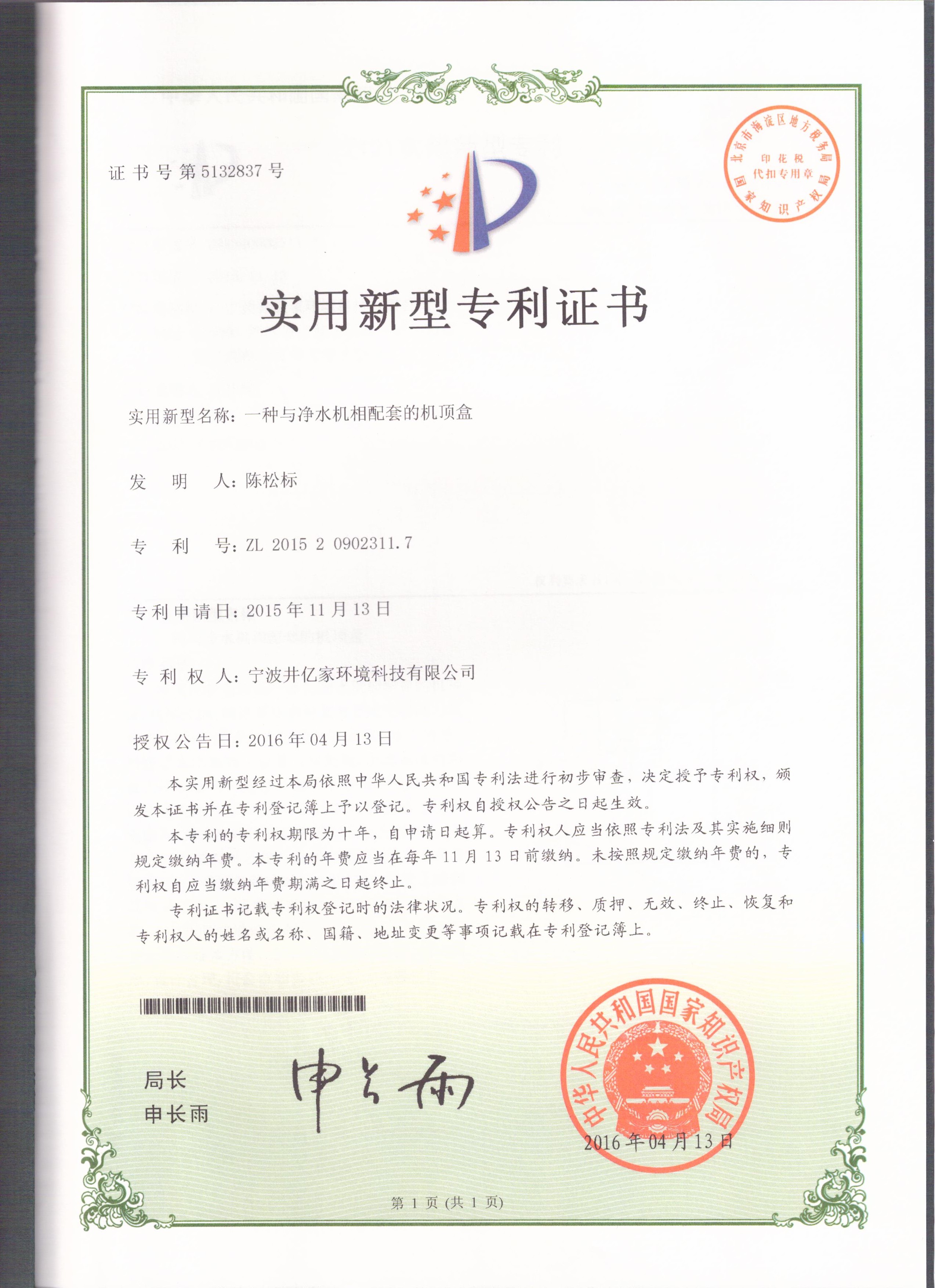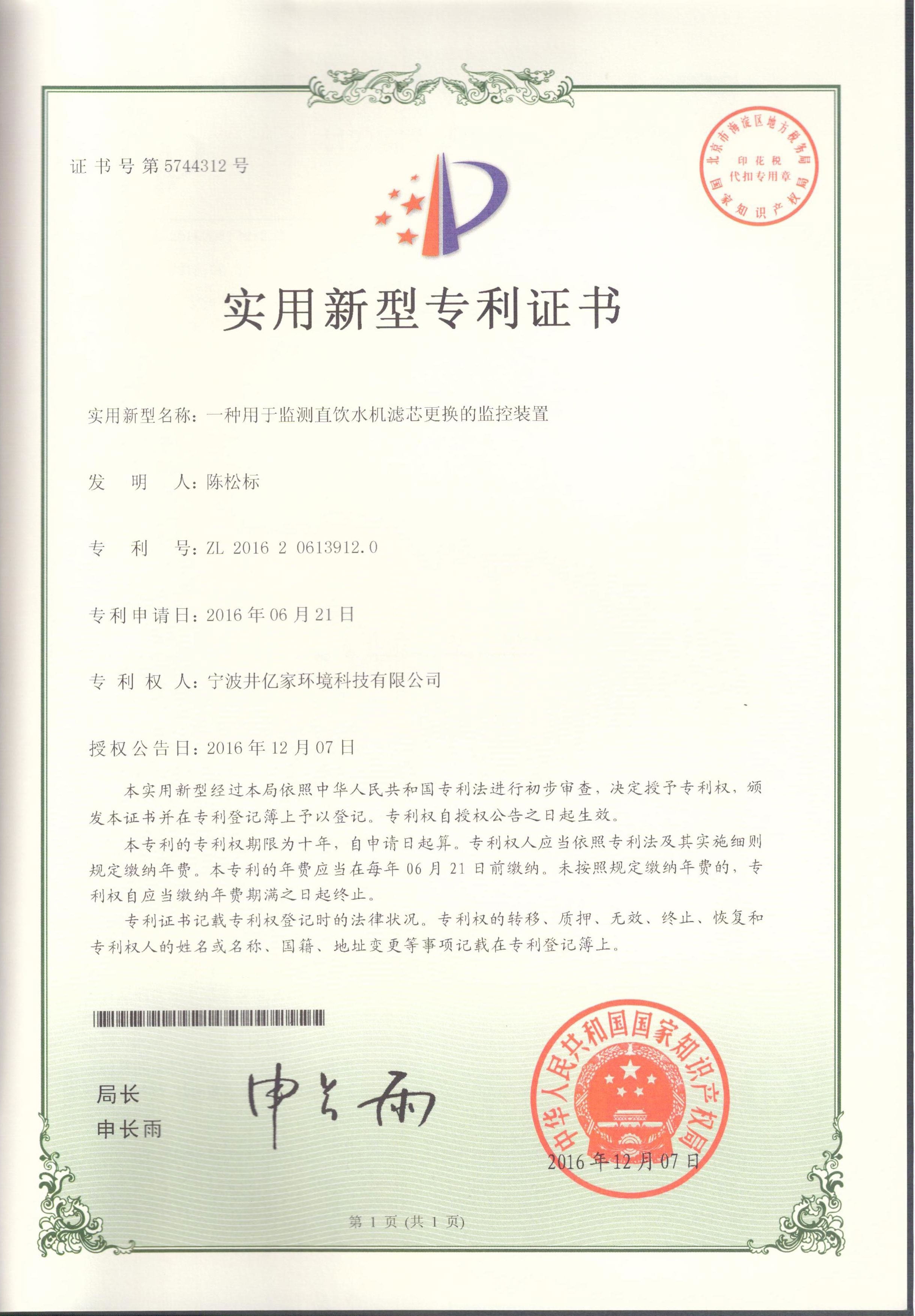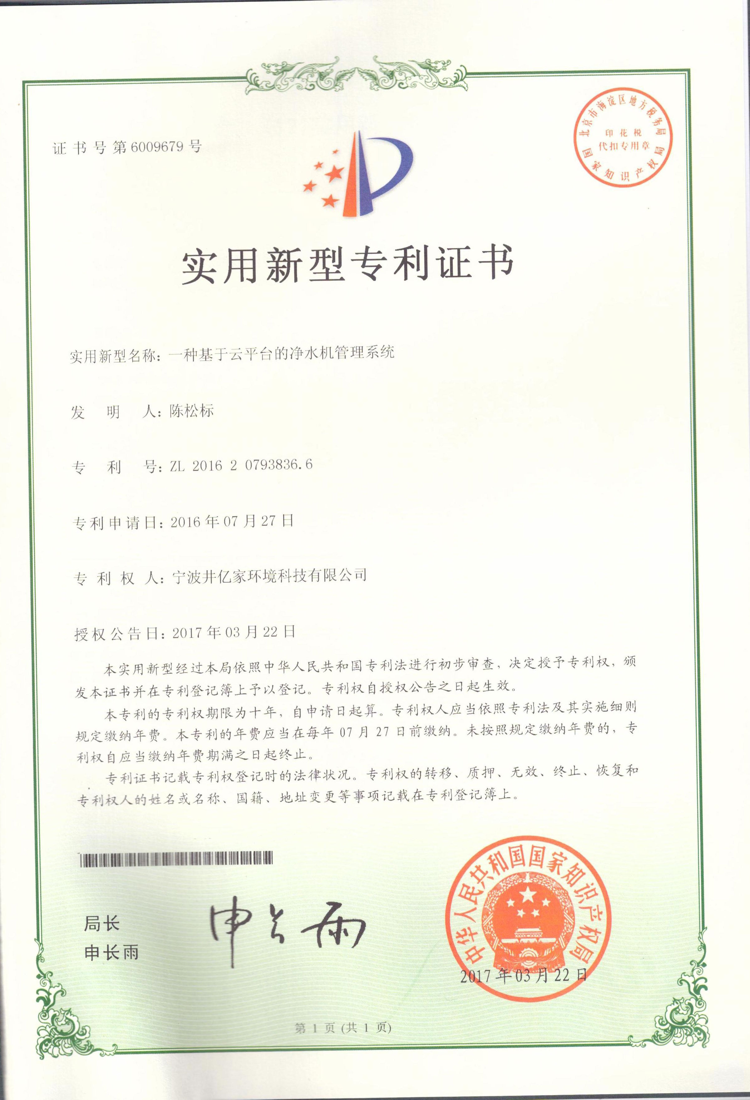 2016 年 1 月,井亿家物联网智能云净水已拥有 3 项发明专利 4 项实用新型专利